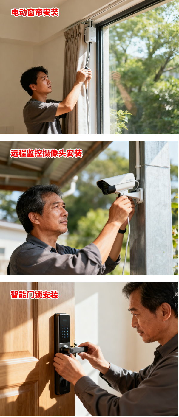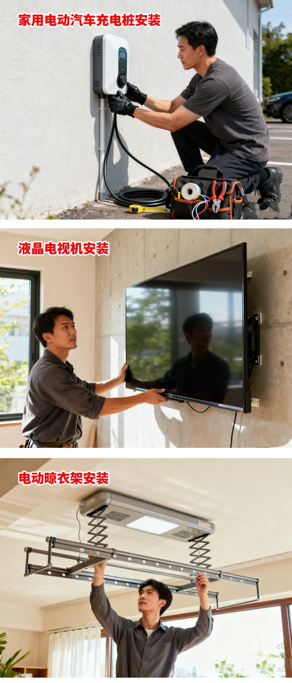 1,空调安装(包含空调移机、加冷媒)。冰箱安装、洗衣机安装、电视安装、电热水器安装、燃气热水器安装、油烟机安装、燃气灶安装、花洒、洗手池安装方法、前置过滤器安装、中央净水器安装、投影仪吊装、灯具安装、汽车充电桩安装(家用)、智能门锁安装、智能马桶安装、远程监控摄像头安装、电动窗帘安装、电动晾衣架安装。